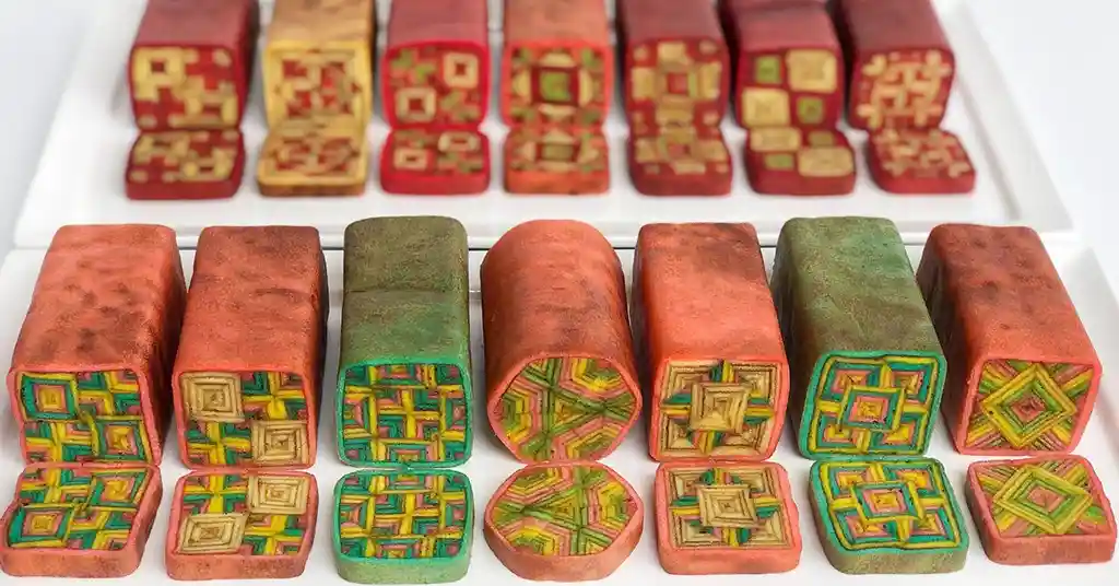Corak tradisional biasanya diinspirasikan daripada motif tekstil dan seni tempatan seperti pua kumbu, tikar mengkuang atau susunan sisik ikan. Lapisan disusun dengan warna kontras yang jelas, lalu membentuk pola simetri apabila dipotong.